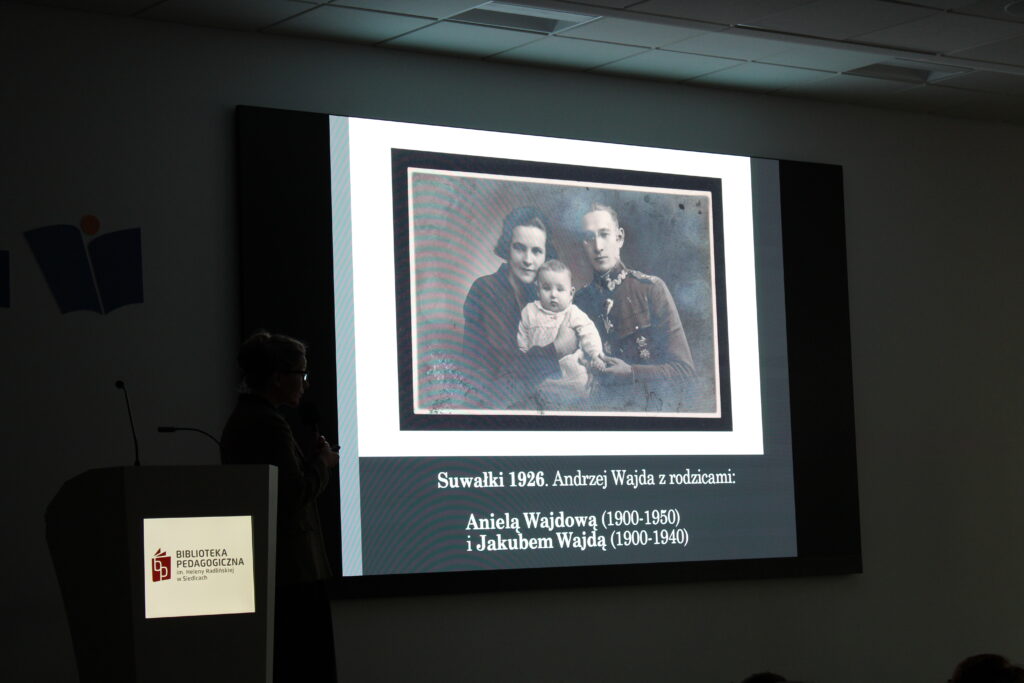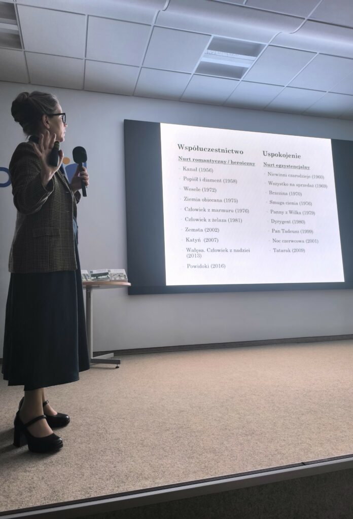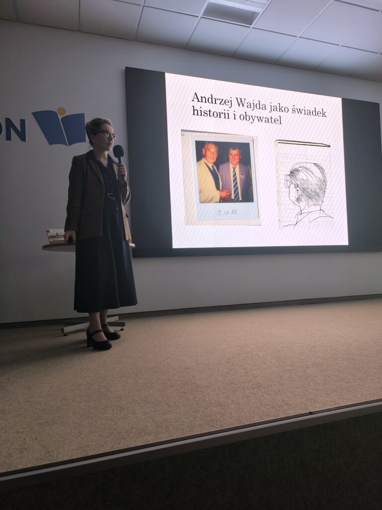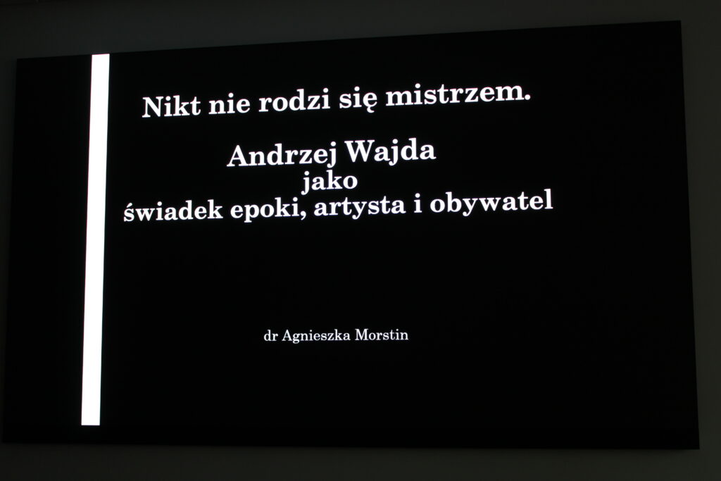 Dr Morstin omówiła najważniejsze etapy twórczości Wajdy – od filmów inicjujących polską szkołę filmową, przez ekranizacje klasyki literatury, aż po kino moralnego niepokoju. Nadmieniła, że Wajda „nie ćwiczył się w pisaniu, lecz pisał tak, jak żył – pracując nad sobą, by móc być twórcą”.