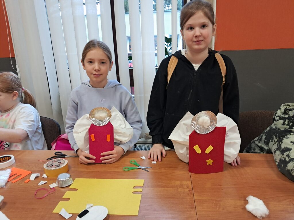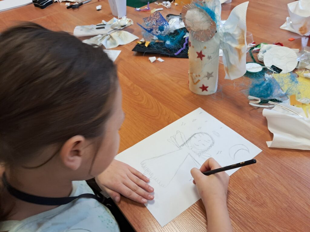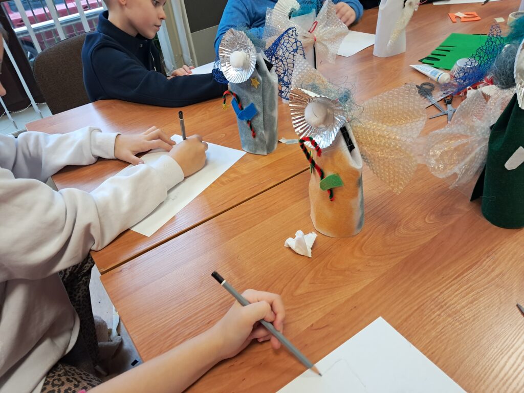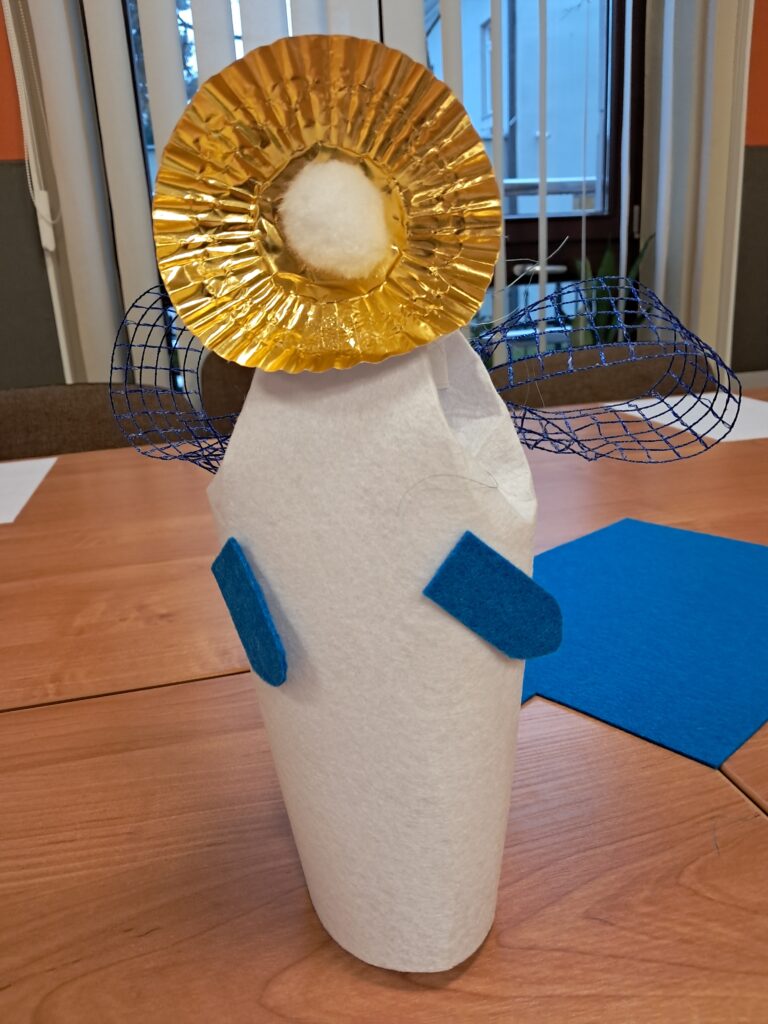 W pierwszej części zajęć dzieci wykonały postać anioła, wykorzystując do tego kartkę A4 filcu, papierową foremkę, rzepy, białe duże pompony, kokardy, białe serwetki, folię bąbelkową, sizal, tasiemki itp. rzeczy. Uczniowie wykonali ciekawe, oryginalne, stojące figury aniołów, które mogą być ozdobą świątecznego stołu lub szafki.