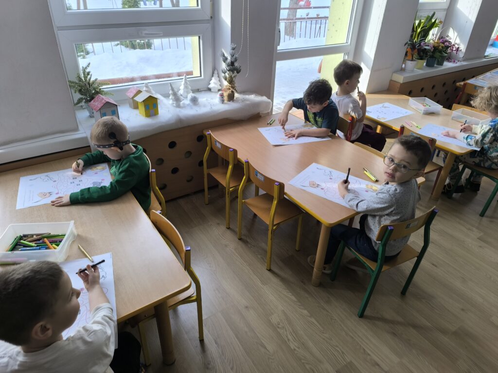 Na zakończenie spotkania maluchy wzięły udział w pracy plastycznej – każde dziecko przygotowało „płotek dla kotka”, kolorując go kredkami i inspirując się przeczytanymi bajkami.