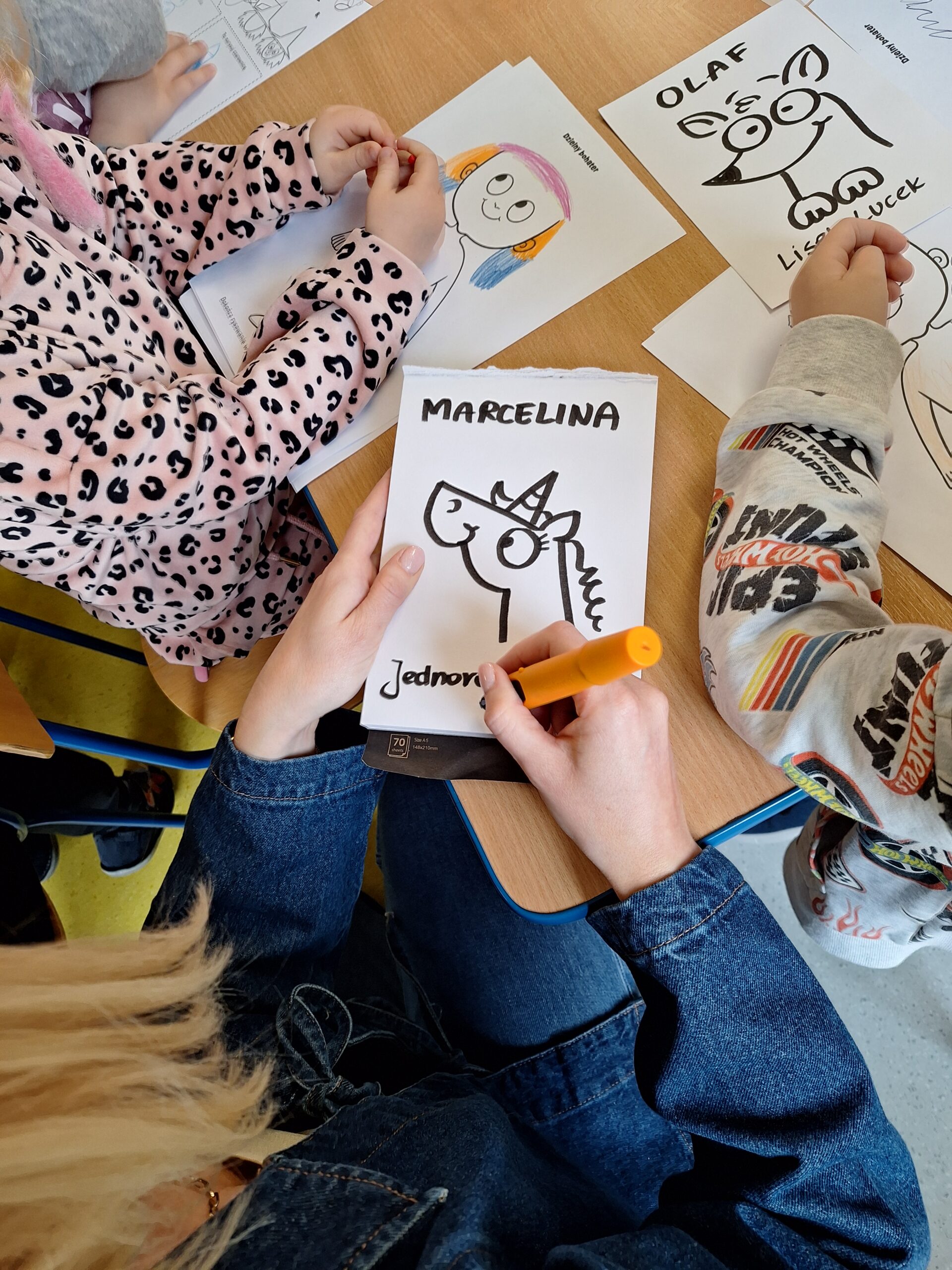 W trakcie spotkania uczyła dzieci rysować różne figury oraz wykonała swój własny rysunek dla każdego dziecka.