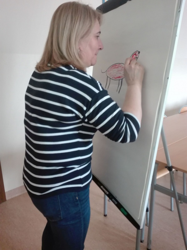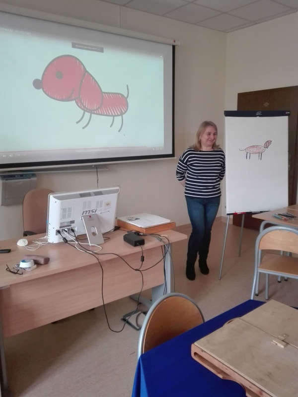 W aktywność dzieci włączyła się również wychowawczyni, która narysowała pieska w oparciu o „Rysowane wierszyki”.