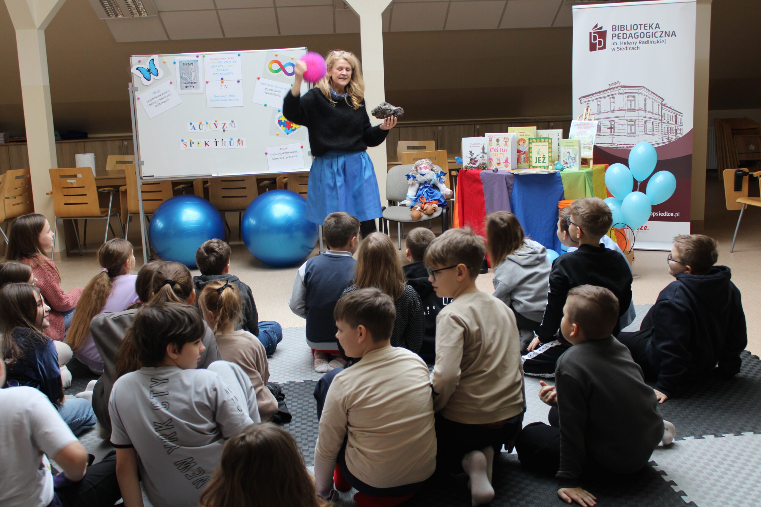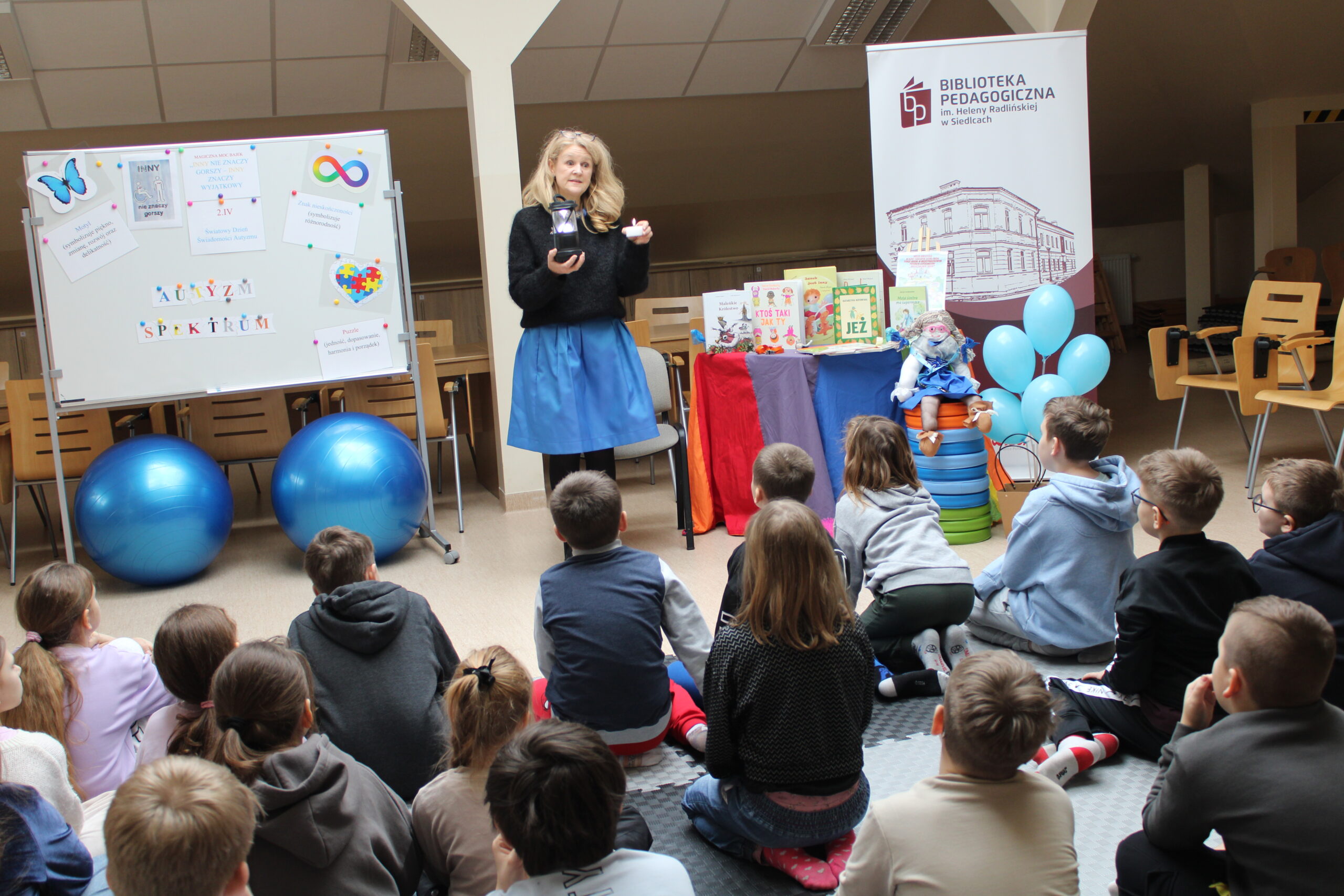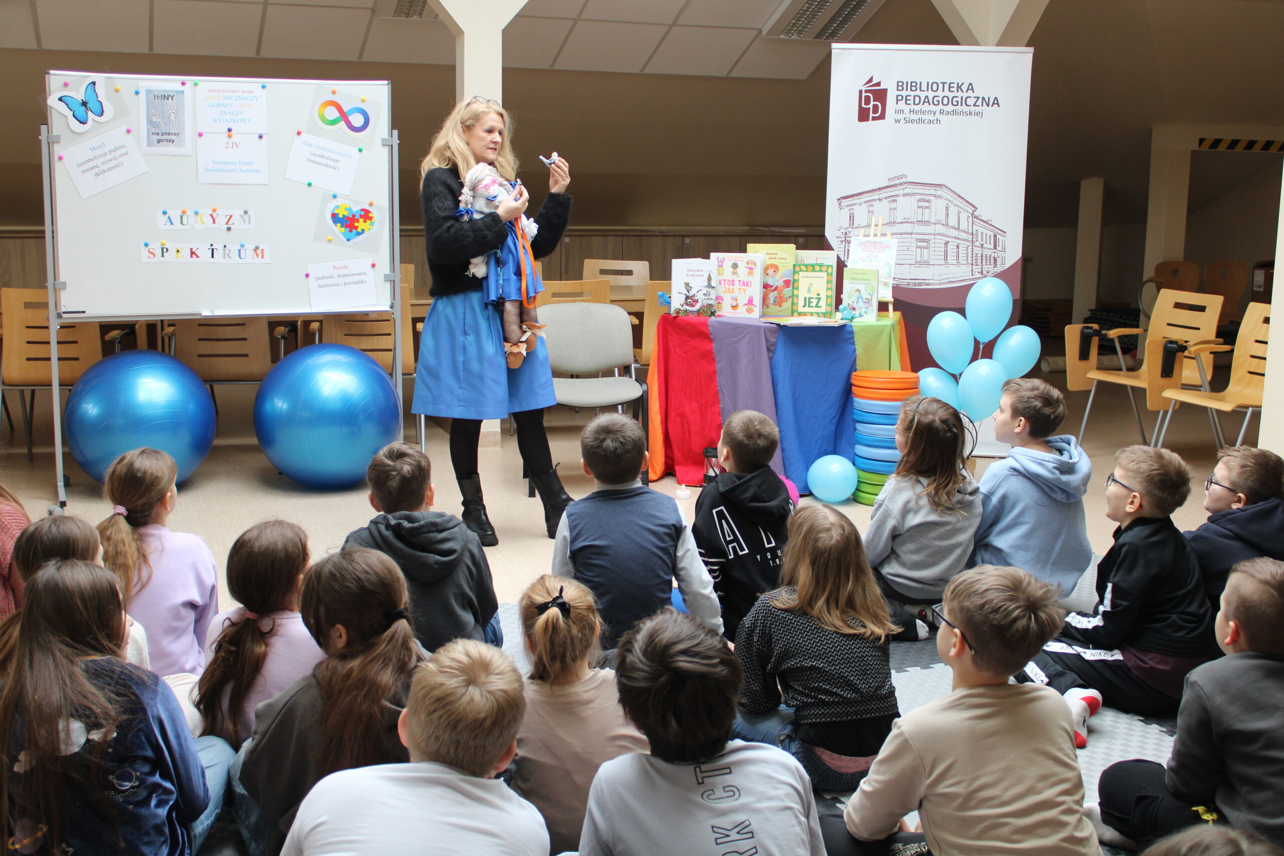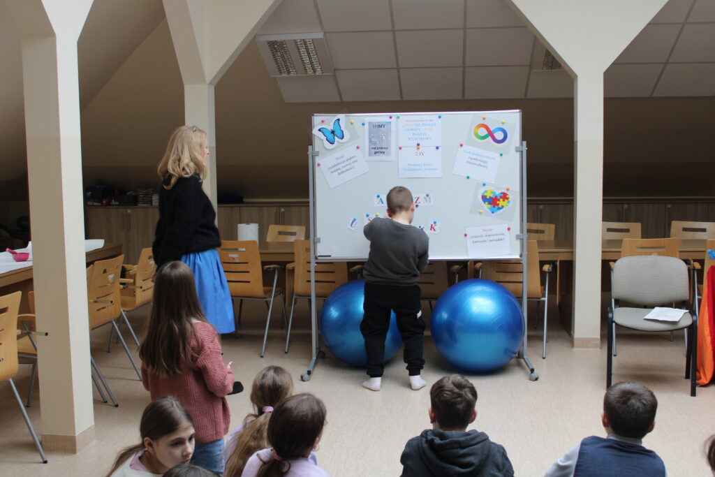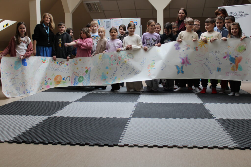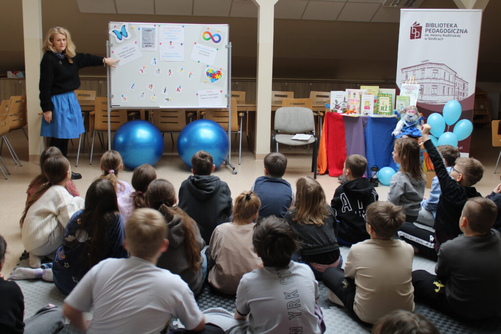 17 lutego w bibliotece odbyły się zajęcia z IV modułu „Międzynarodowego Projektu Magiczna Moc Bajek – Razem Pokonamy Każdą Barierę”. Uczestnikami spotkania były dzieci z klasy III b Szkoły Podstawowej nr 7 w Siedlcach. Kolor niebieski, znak nieskończoności, puzzle czy motyl są symbolami osób znajdujących się w spektrum autyzmu i tej tematyce poświęcona była lekcja. Po krótkiej wymianie informacji, dzieci miały możliwość wysłuchania fragmentów opowiadania Roksany Jędrzejewskiej -Wróbel pt. „Kosmita”. Razem z naszą maskotką Kulturką pokazałam uczestnikom jak mogą odczuwać dźwięk, dotyk, zapach czy światło osoby dotknięte tym problemem. To co dla większości dzieci jest normą, przyjemnością, dla osoby w spektrum może być sytuacją nie do zniesienia. Zabawa z kudłaczkiem w różnorodność, stała się niezłą atrakcją. Zwieńczeniem spotkania było wykonanie „Plakatu Świadomości – Tworzymy wspólną mozaikę” na którym dzieci mogły uzewnętrznić swoje symboliczne postrzeganie inności. Wspólnie spędzony czas zakończyliśmy pamiątkowym zdjęciem oraz niebieskim smakołykiem. Dziękuje bardzo Pani Dyrektor Dorocie Salamon, Paniom z biblioteki, Paniom Wychowawczyniom oraz Dzieciom za udział w zajęciach. Mam nadzieję, że to spotkanie pozwoli uczestnikom w bardziej szczególny sposób spojrzeć na inność, która jest wyjątkowa.