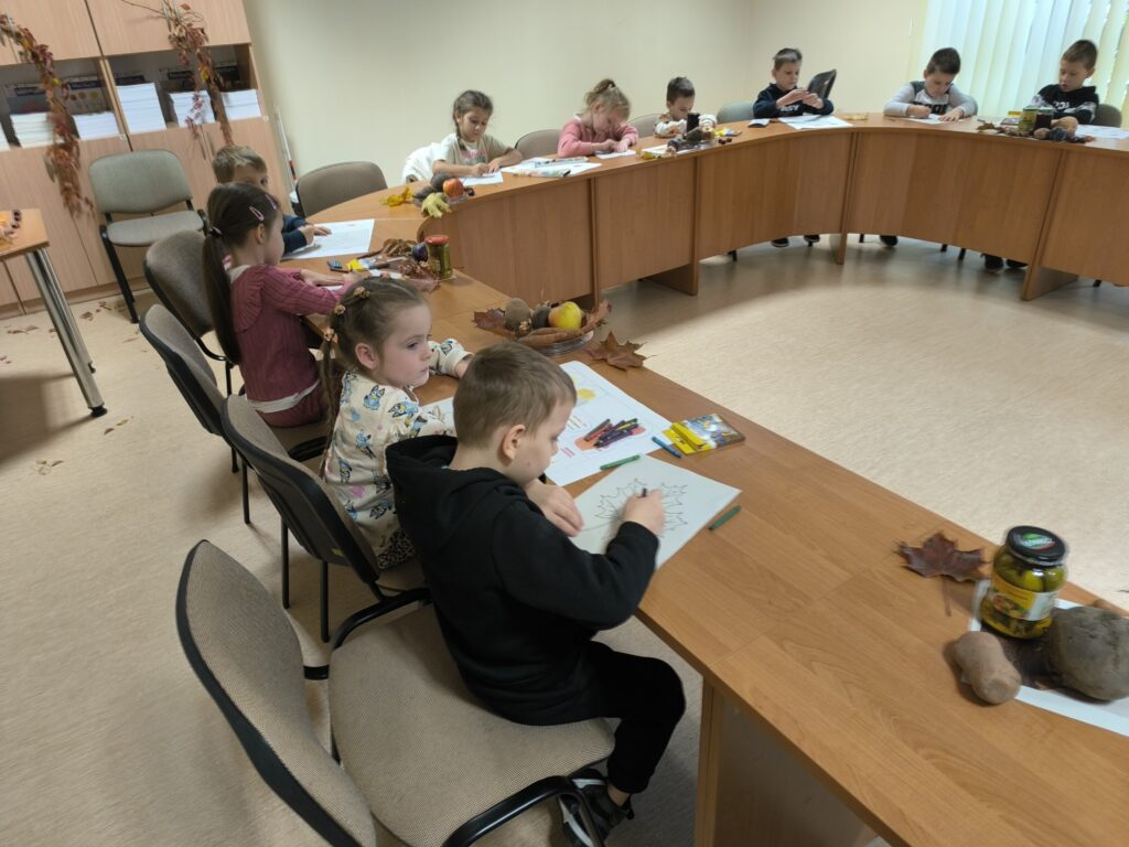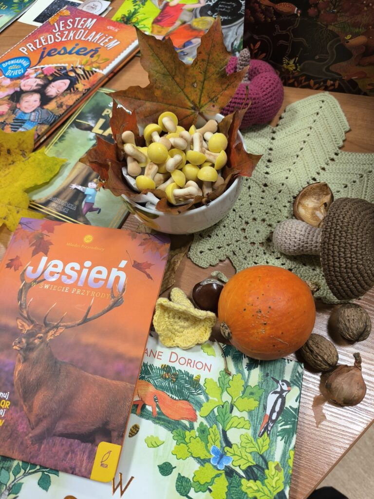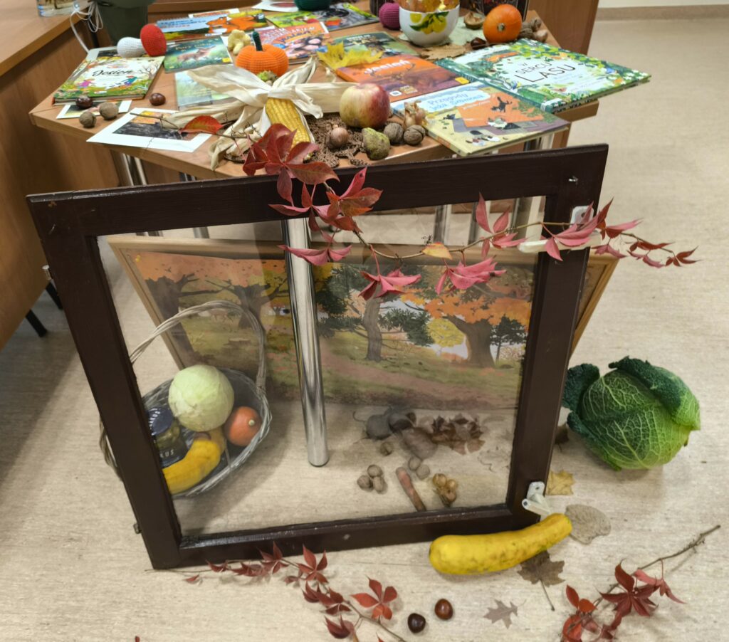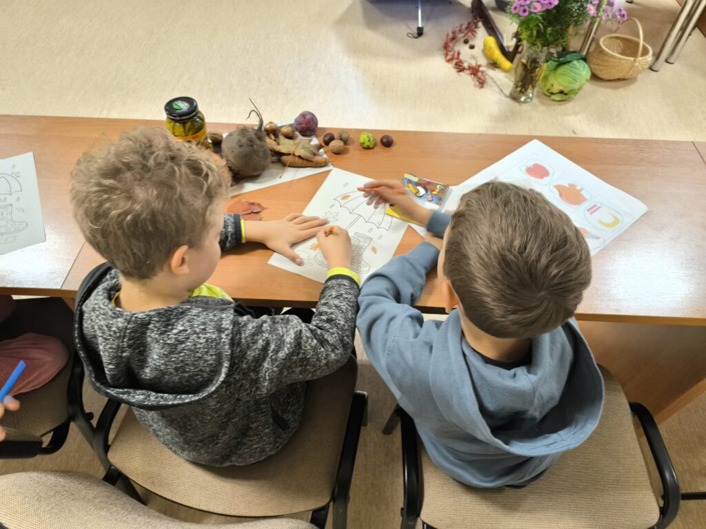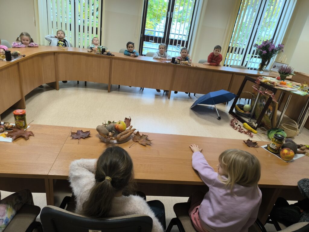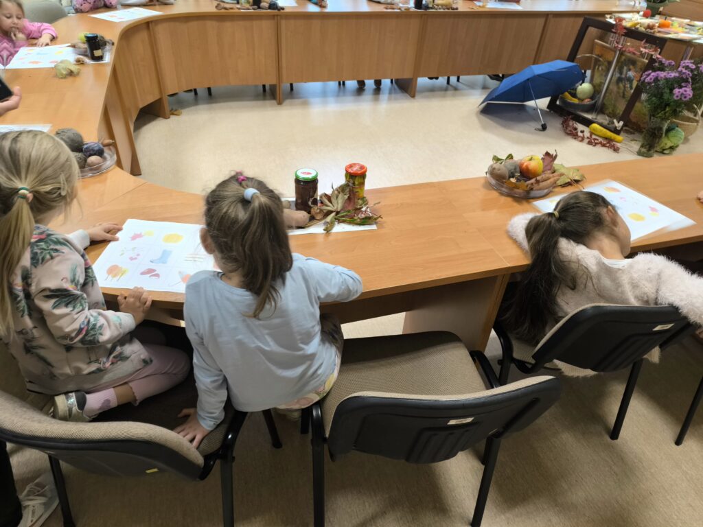 Na zakończenie zajęć dzieci wspólnie przygotowały koszyk darów dla Jesieni wypełniony owocami, warzywami i liśćmi. Obejrzały również bajkę „Jesienna przygoda”, która była doskonałym podsumowaniem dnia w bibliotece.