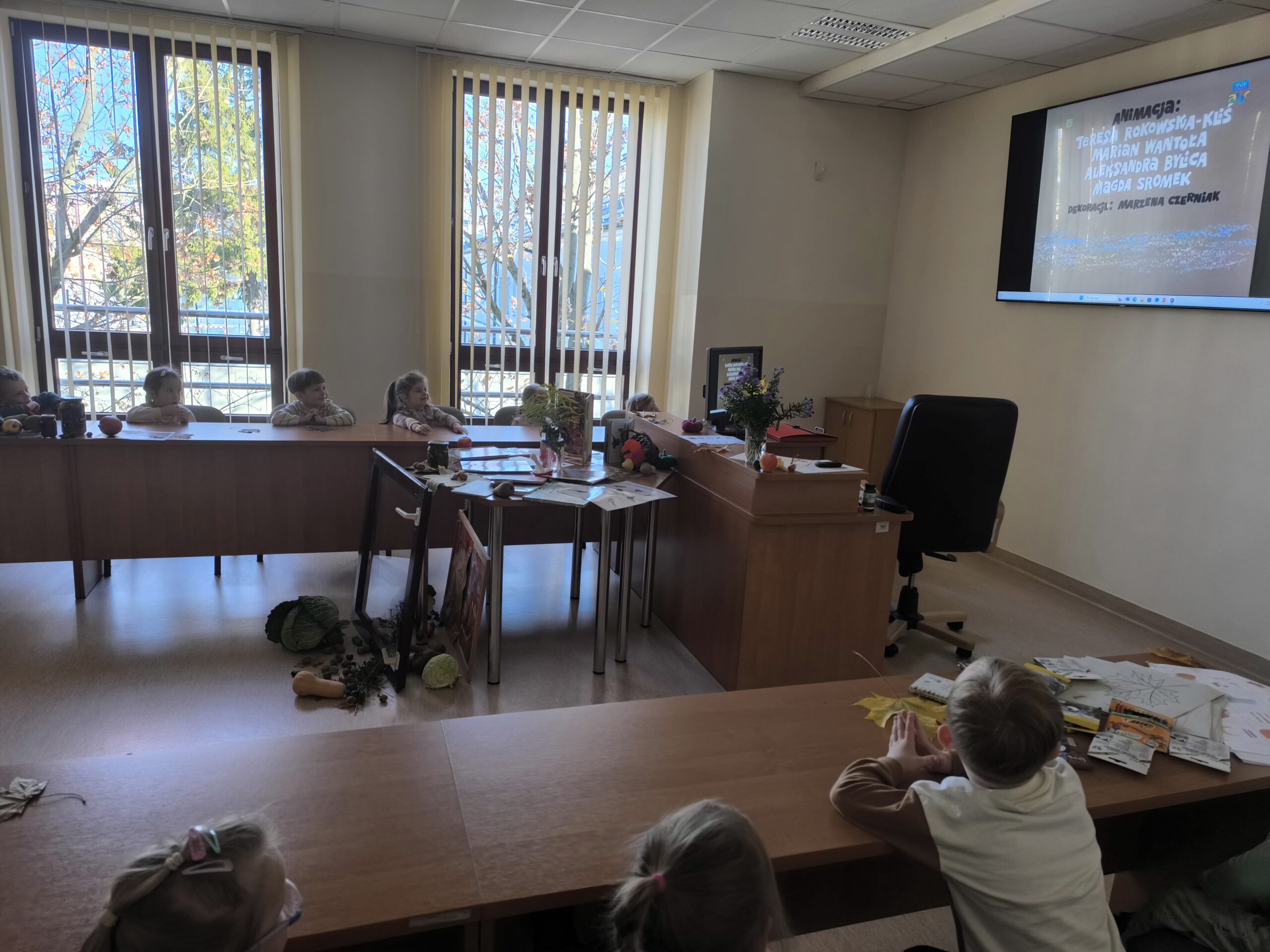 Nie zabrakło również bajki – dzieci obejrzały „Jesienną przygodę”, a na zakończenie wspólnie przygotowały koszyk darów dla Jesieni, wypełniony owocami, warzywami i liśćmi.