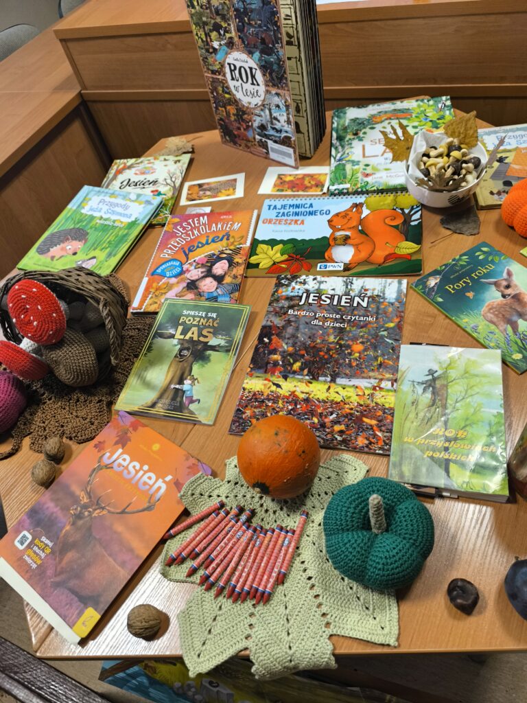 Podczas spotkania najmłodsi poznali książki o tematyce jesiennej, pełne barwnych ilustracji, dowiedzieli się również o jesiennych przysłowiach i chętnie dzielili się własnymi spostrzeżeniami. W części plastycznej powstały piękne prace przedstawiające liście, grzyby oraz jesienne krajobrazy.