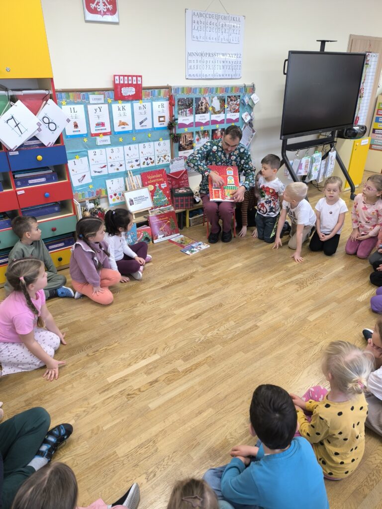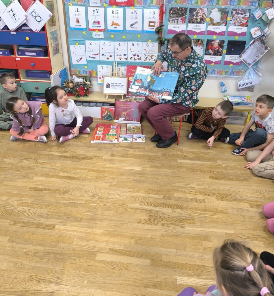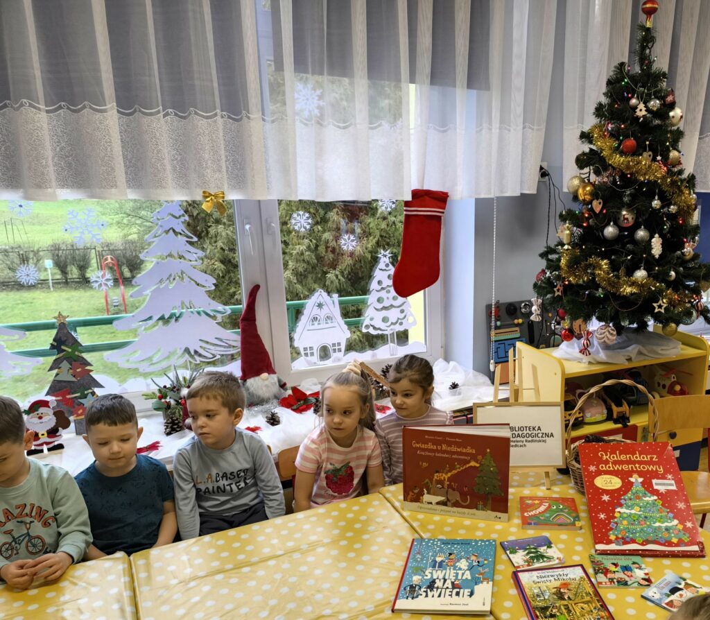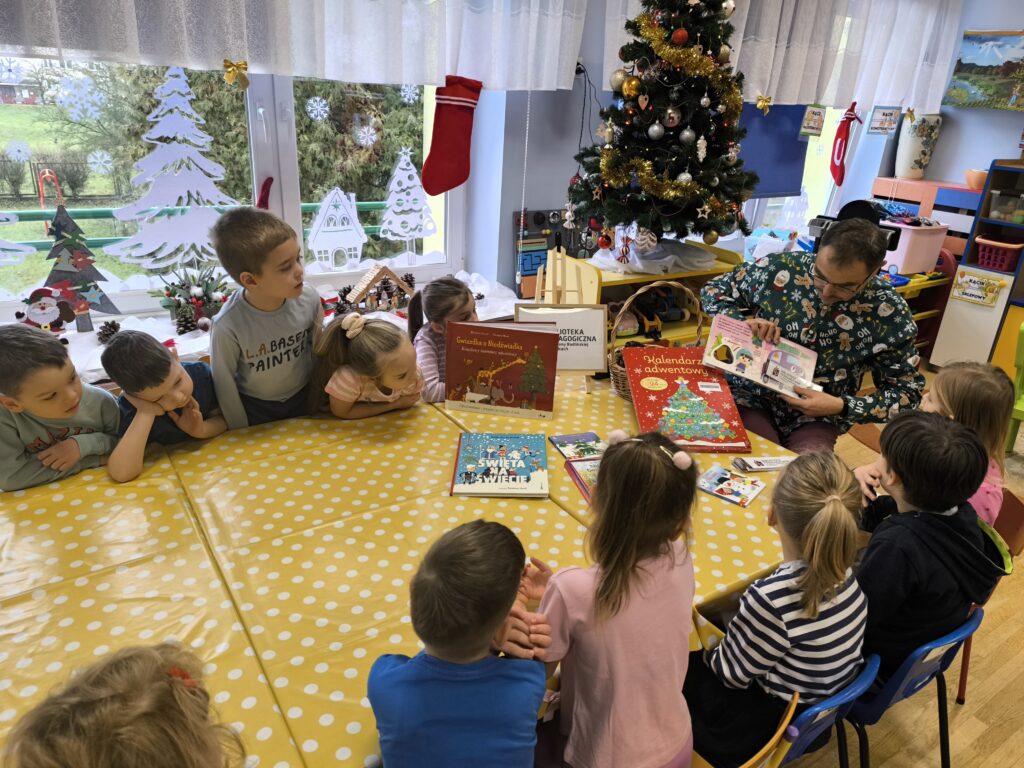 Każda z czytanych książek wprowadzała dzieci w świąteczną atmosferę: od radosnych przygotowań, przez zimowe przygody, aż po refleksję nad tym, co oznacza dzielenie się dobrem w tym wyjątkowym czasie. Przedszkolaki słuchały z ogromnym zaciekawieniem i aktywnie uczestniczyły w spotkaniu.