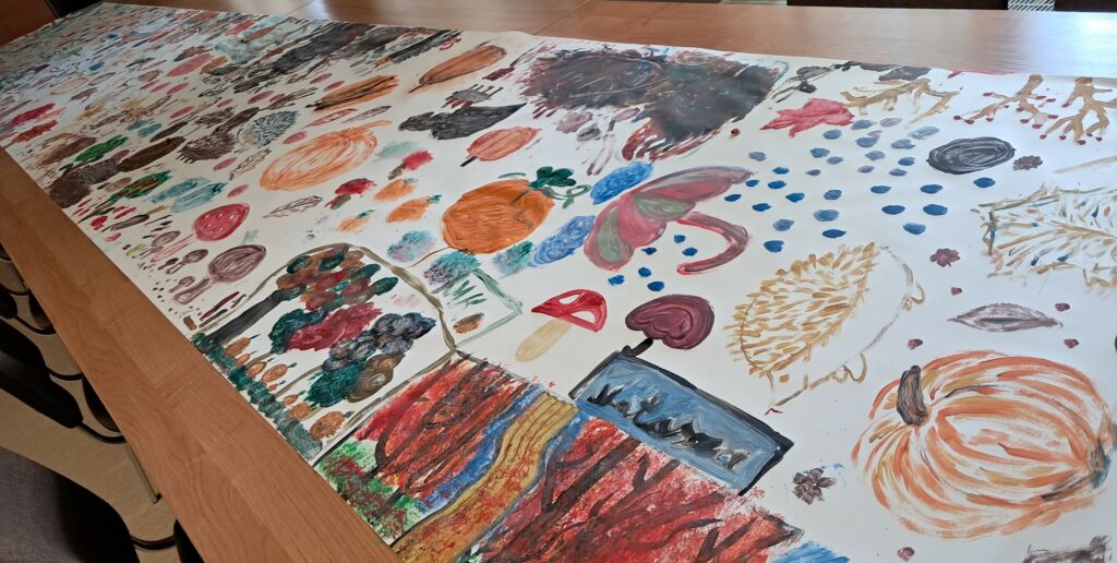 Uczniowie wykonali malarski jesienny dywan. Złożyły się na niego przedstawienia elementów roślinnych i zwierzęcych typowych dla tej pory roku. Pojawiły się tutaj elementy lasu, drzew, liści, a także grzyby, dynie, jeże, parasole itp. Dzieci posługiwały się w swojej pracy farbami w tonacjach ciepłych, charakterystycznych dla jesieni. Praca wykonana została w dużym formacie.
