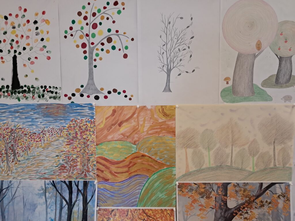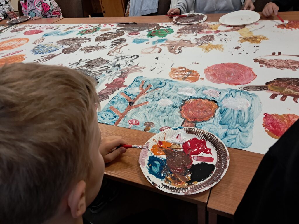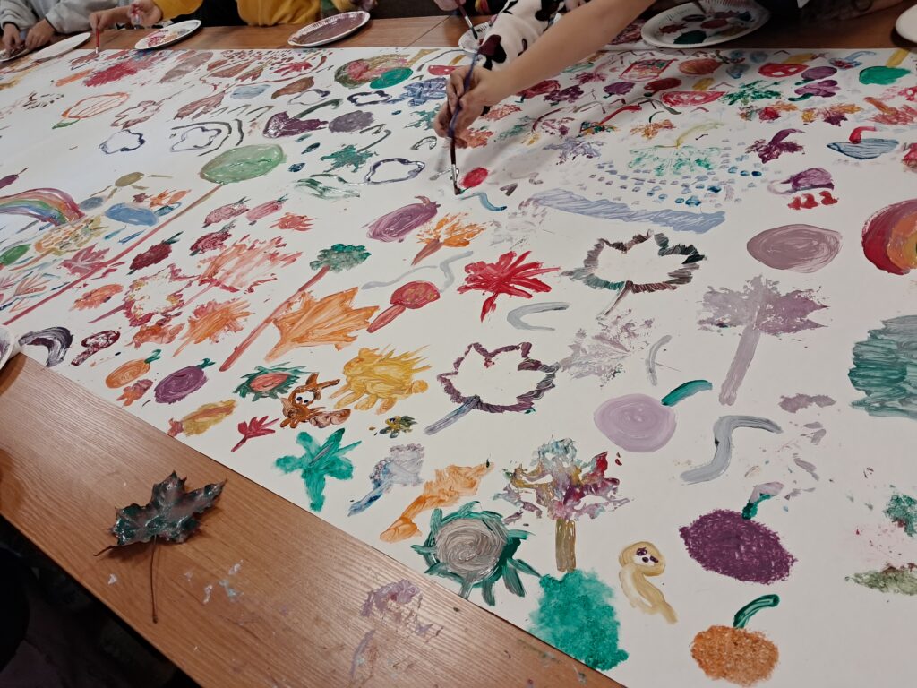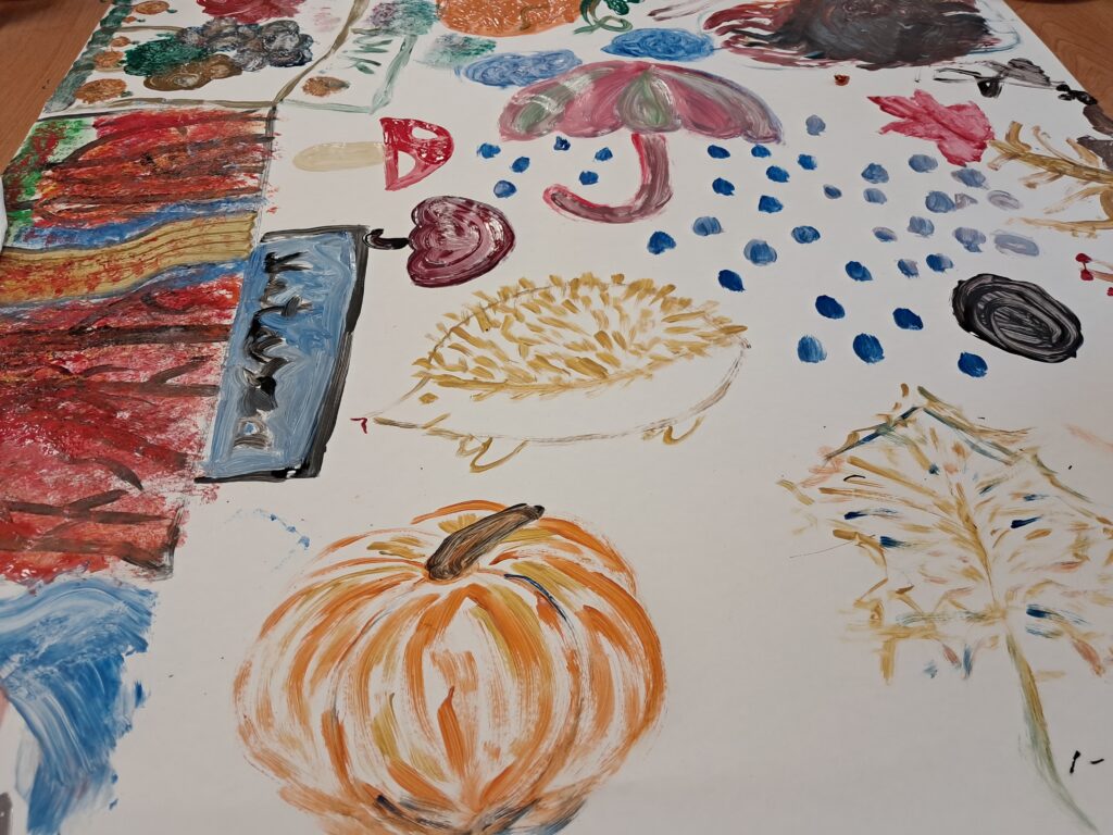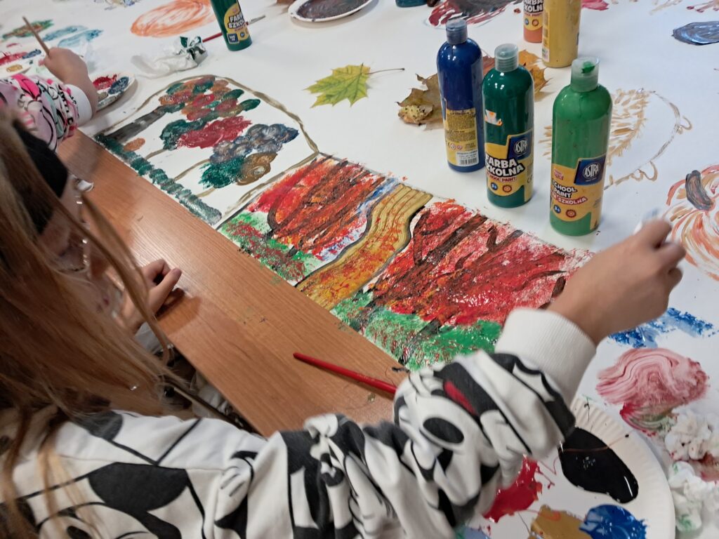 Uczniowie wykonali malarski jesienny dywan. Złożyły się na niego przedstawienia elementów roślinnych i zwierzęcych typowych dla tej pory roku. Pojawiły się tutaj elementy lasu, drzew, liści, a także grzyby, dynie, jeże, parasole itp. Dzieci posługiwały się w swojej pracy farbami w tonacjach ciepłych, charakterystycznych dla jesieni. Praca wykonana została w dużym formacie.