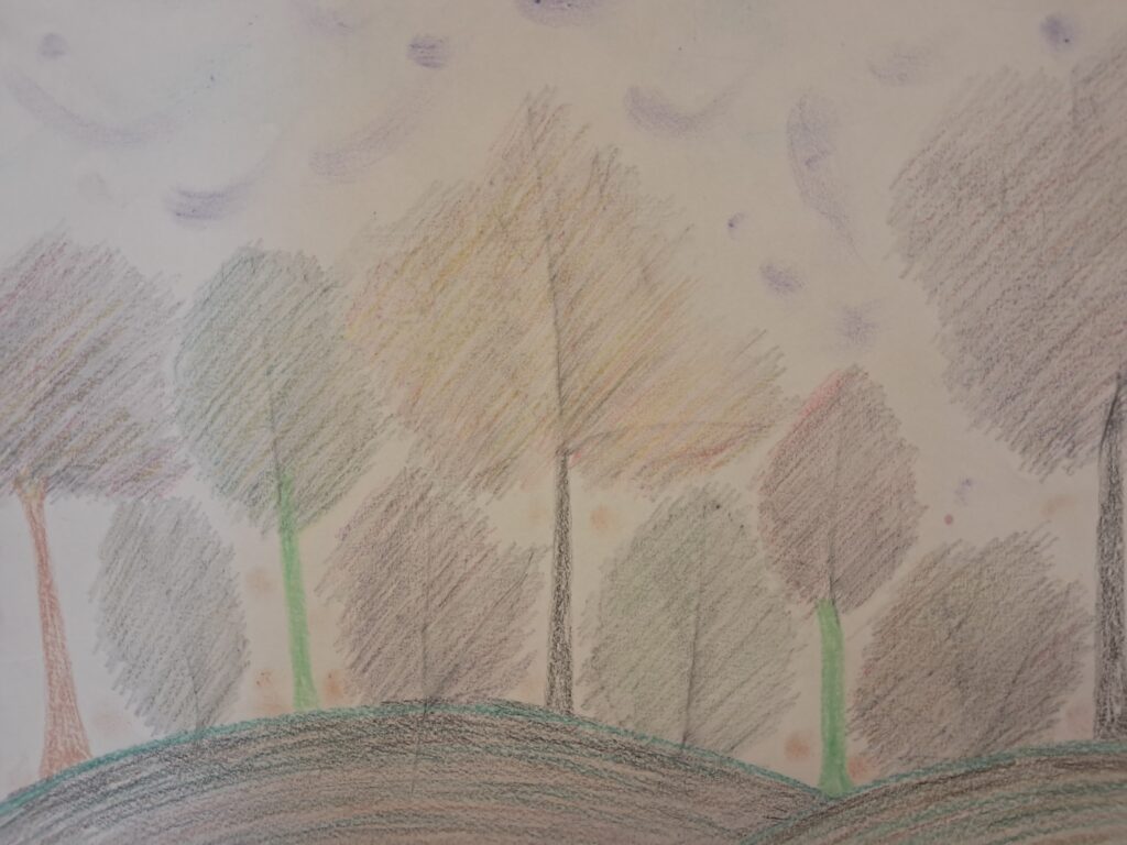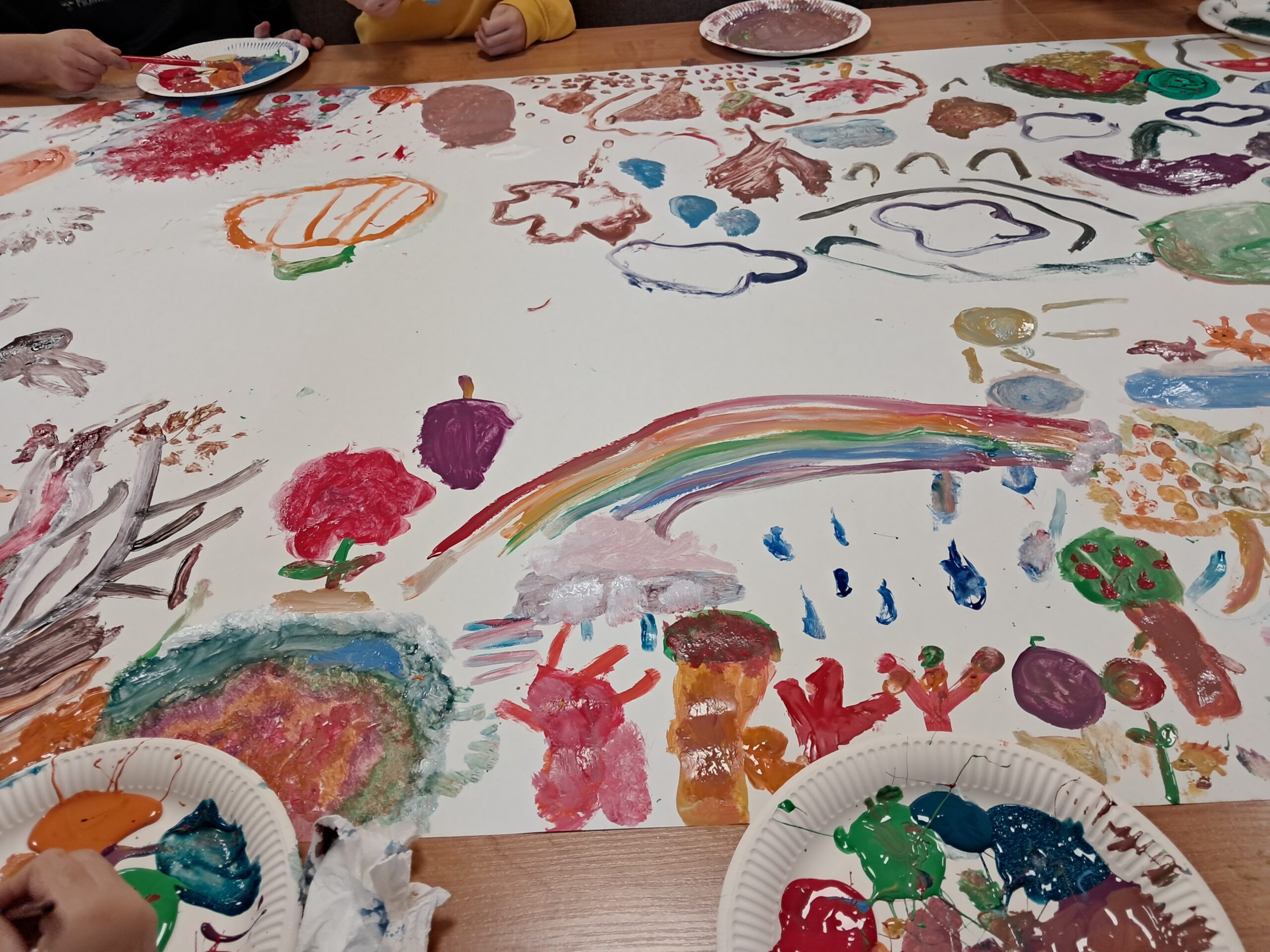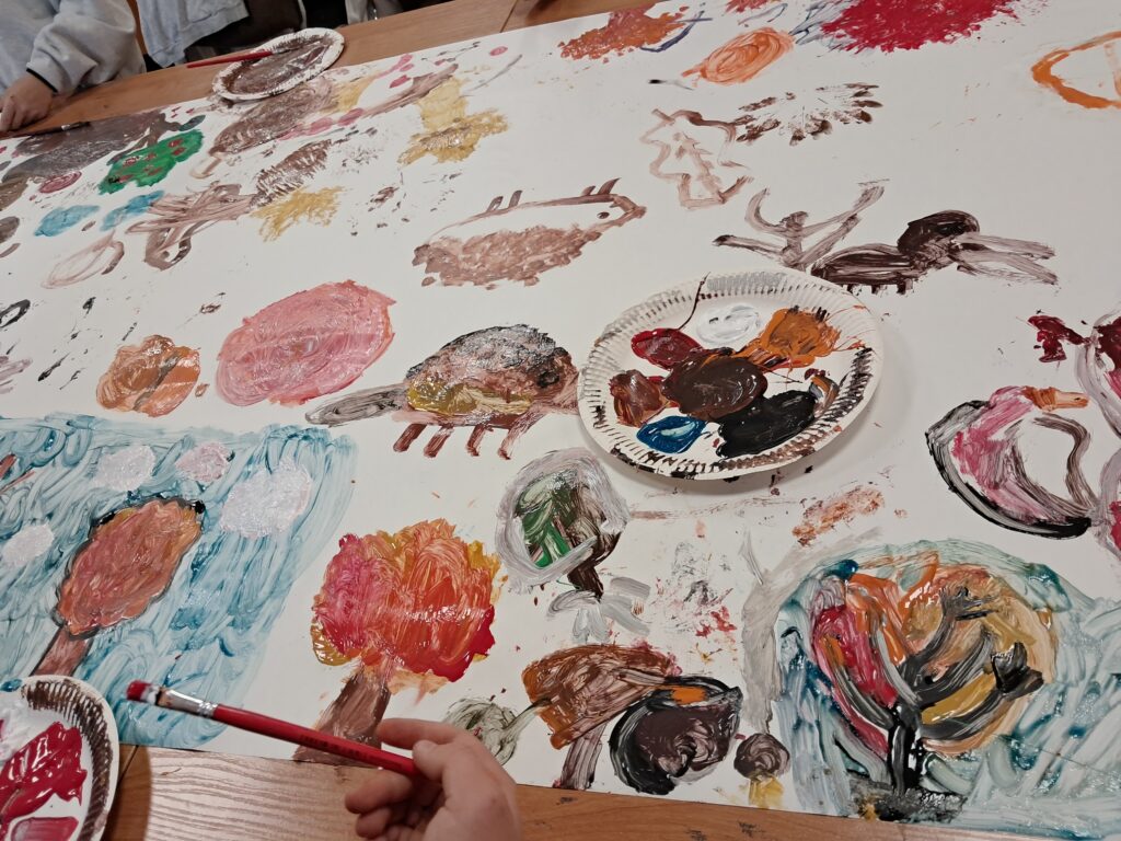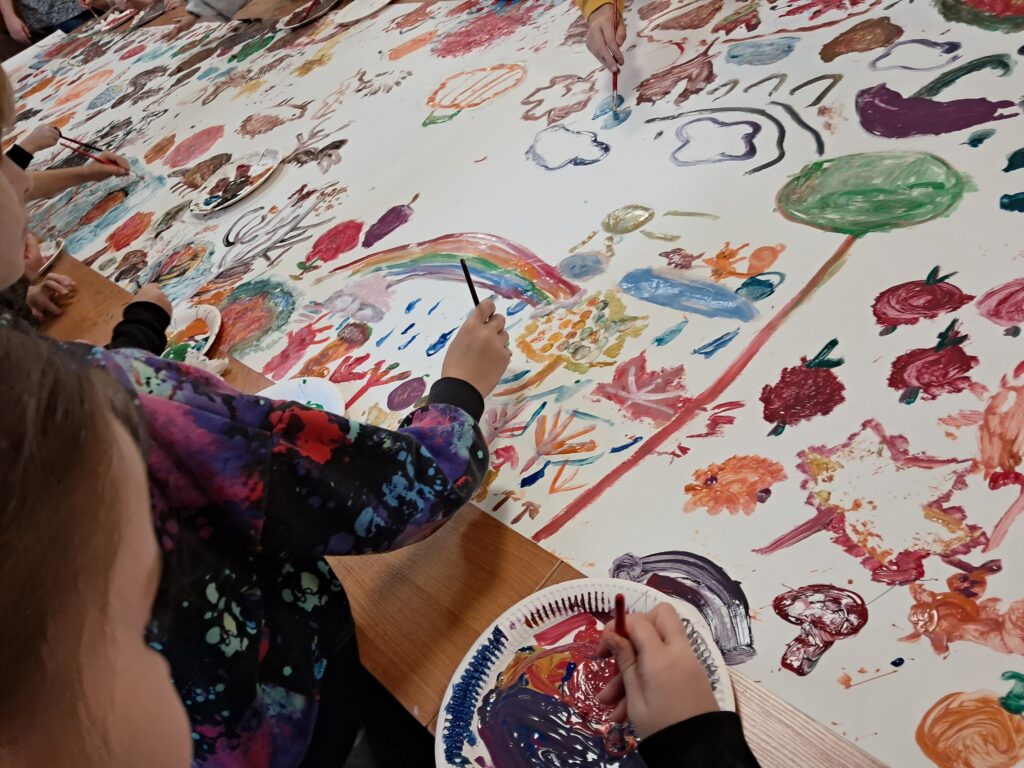 Uczniowie wykonali malarski jesienny dywan. Złożyły się na niego przedstawienia elementów roślinnych i zwierzęcych typowych dla tej pory roku. Pojawiły się tutaj elementy lasu, drzew, liści, a także grzyby, dynie, jeże, parasole itp. Dzieci posługiwały się w swojej pracy farbami w tonacjach ciepłych, charakterystycznych dla jesieni. Praca wykonana została w dużym formacie.
