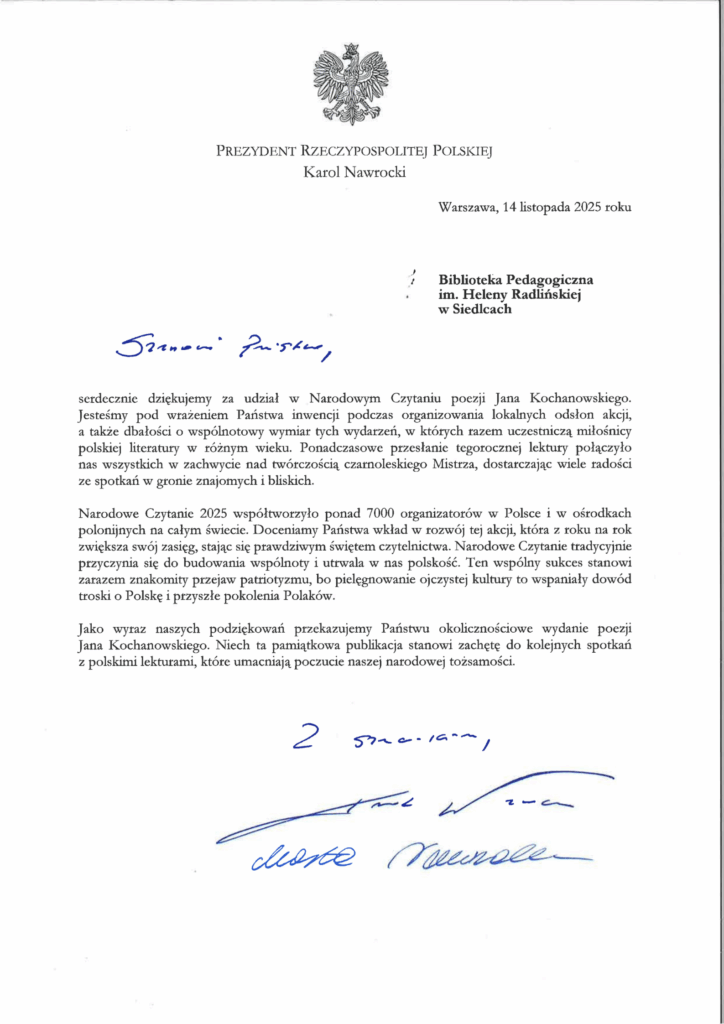Z radością dzielimy się z naszymi czytelnikami podziękowaniami i książką otrzymanymi od Pary Prezydenckiej. Udział w tej akcji był dla nas wyjątkowym przeżyciem i ważnym wydarzeniem. Mamy nadzieję, że w przyszłym roku również włączymy się do udziału w Narodowym Czytaniu.