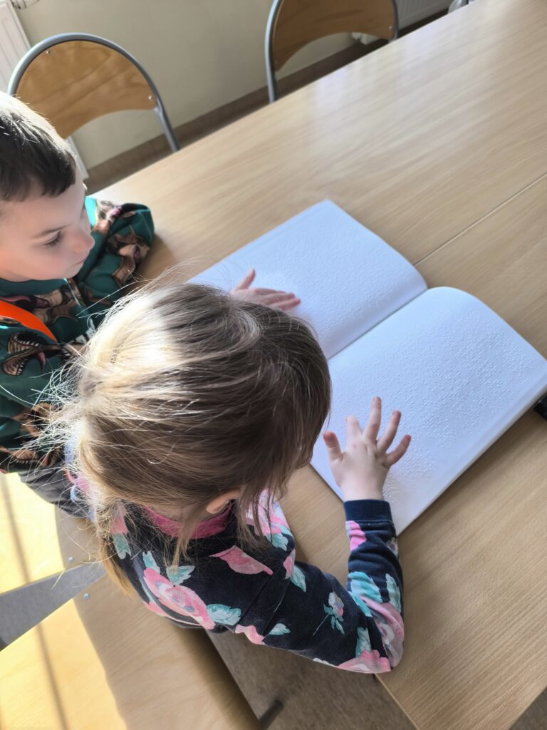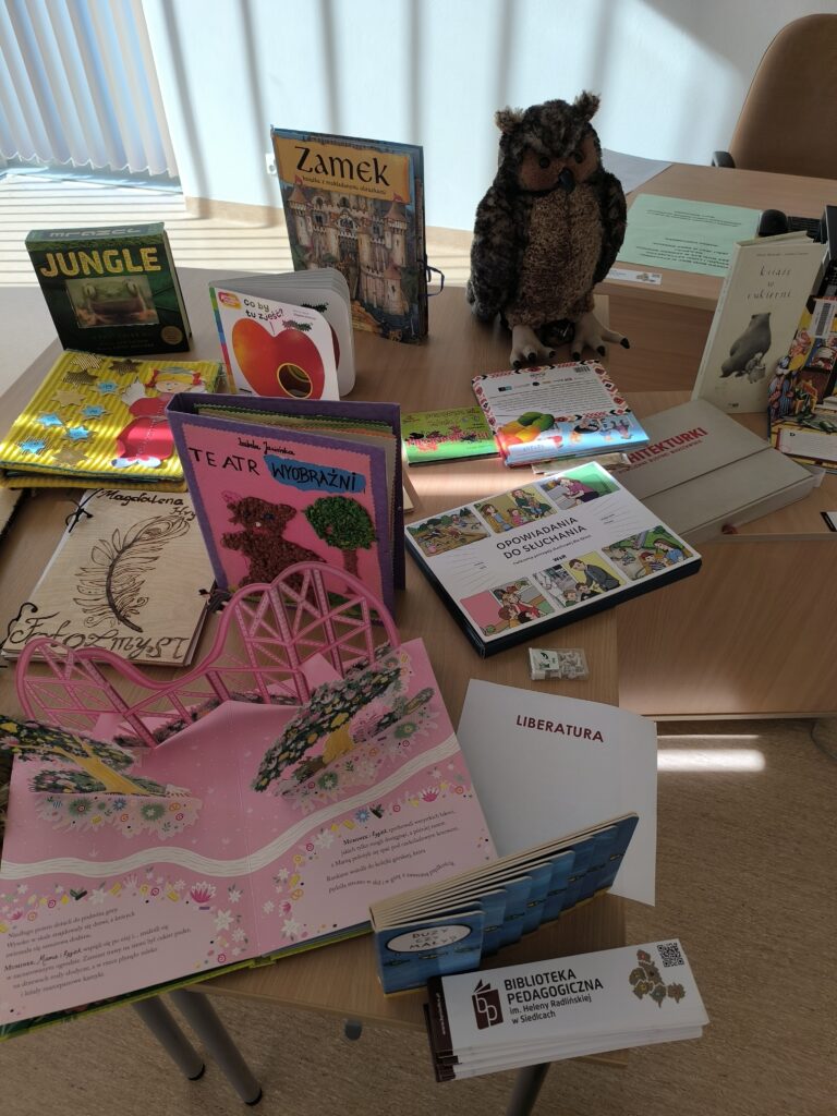 Podczas zajęć dzieci obejrzały wyjątkowe i nietypowe książki z naszego księgozbioru: od magicznej książki, przez najmniejszą i największą, aż po książki pachnące truskawką czy te w formie przestrzennej. Dużym zainteresowaniem cieszyły się również książki wykonane przez starszych uczniów, nadesłane na konkurs „Wydajemy własną książkę”.