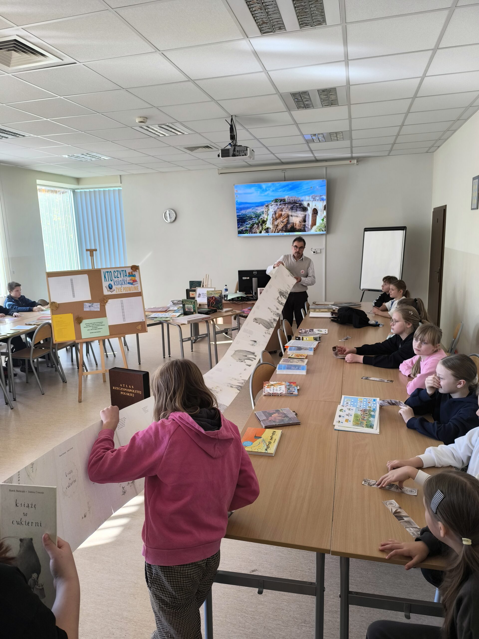 Podczas spotkania uczniowie mieli okazję rozwiązywać tematyczne krzyżówki, uczestniczyć w rozmowach o książkach i czytaniu, a także obejrzeć nietypowe wydawnictwa oraz zbiory znajdujące się w bibliotece.