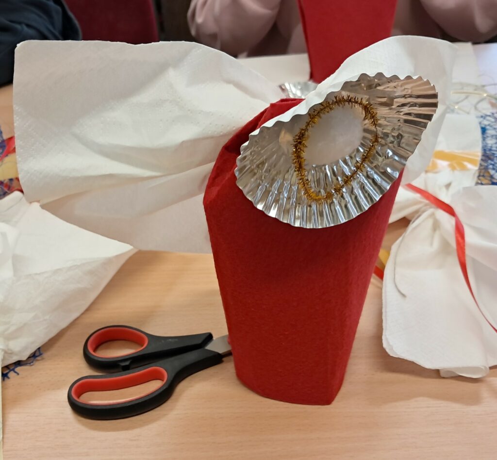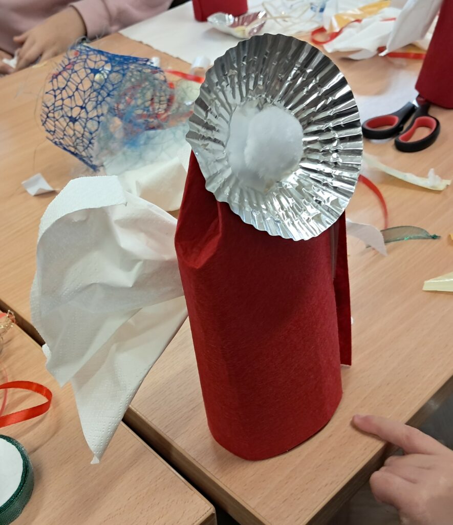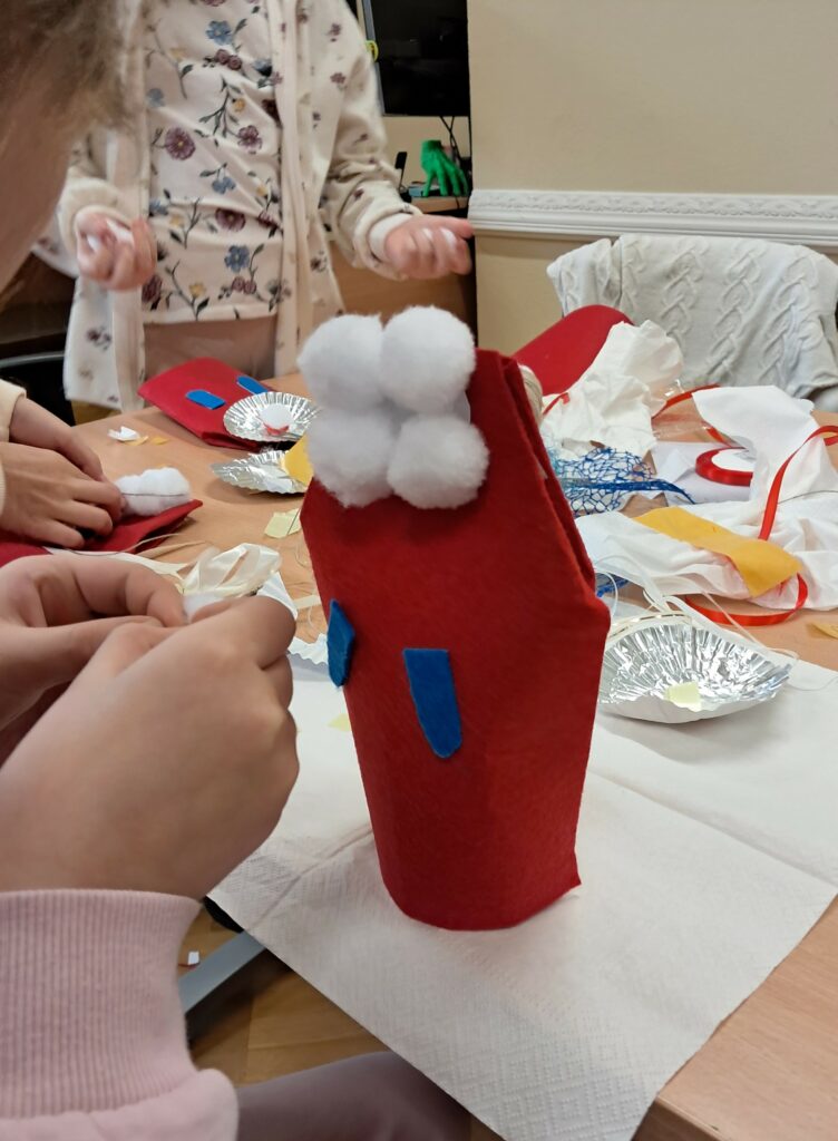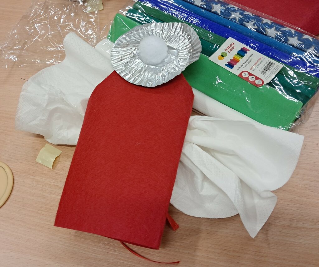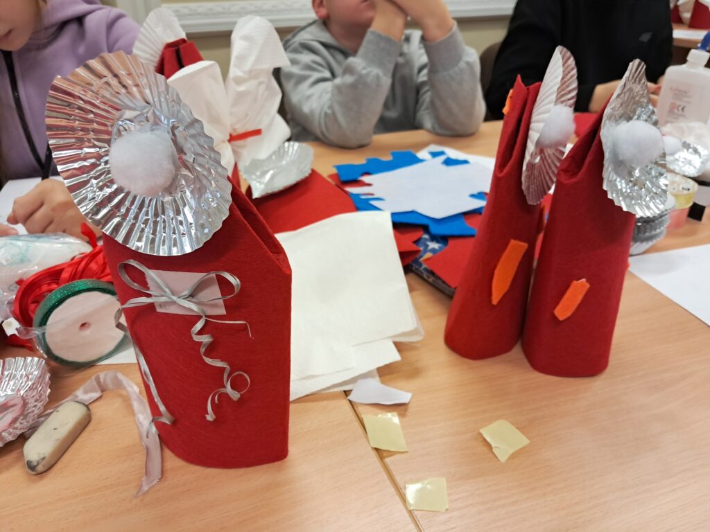 W pierwszej części spotkania dzieci zrobiły figurę Świętego Mikołaja lub skrzydlatego anioła (do wyboru). Wykorzystali do tego m.in. czerwony filc, rzepy, foremki do ciastek, białe pompony, wstążki, białe serwetki. Powstały kolorowe, oryginalne prace, które mogą być ozdobą świątecznego mieszkania.