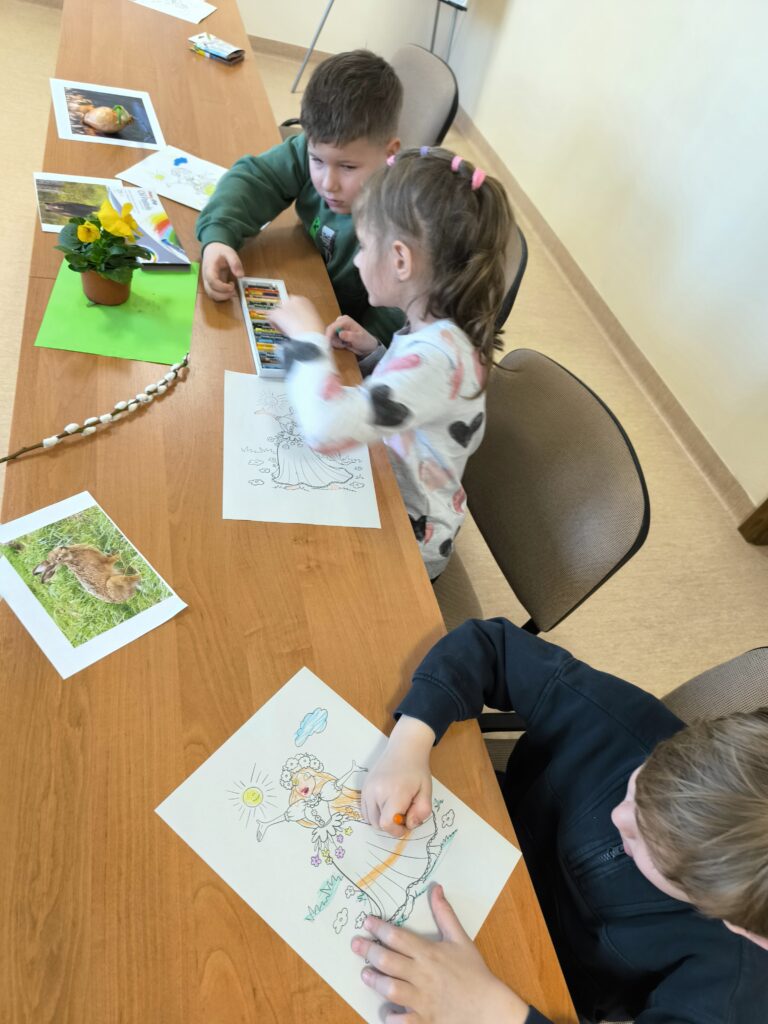 W części plastycznej uczestnicy malowali portret Pani Wiosny, tworząc barwne, pełne wyobraźni prace. Poznawali również przysłowia związane z tą porą roku oraz wysłuchali wierszy o wiośnie. Podczas zajęć dzieci miały okazję wysłuchać utworu „Cztery Pory Roku – Wiosna” Antonio Vivaldiego, który wprowadził wszystkich w radosny nastrój. Na zakończenie spotkania obejrzały film „Bolek i Lolek – wiosenne porządki”, stanowiący miłe podsumowanie tematu zajęć o wiośnie.