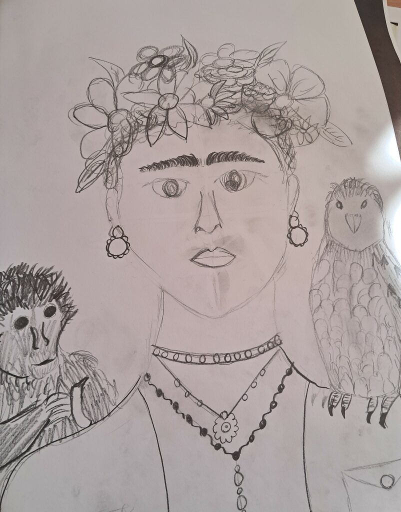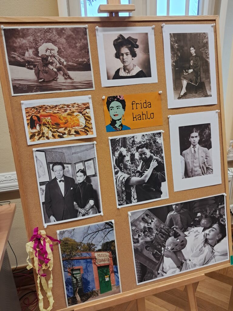 W pierwszej części zajęć młodzież wysłuchała opowieści o życiu i twórczości malarki. Dowiedziała się o jej rodzicach, dzieciństwie, trudnej młodości, mężu, chorobie oraz poglądach społecznych i politycznych. Pomimo ciężkiej choroby nie poddała się i walczyła o swoje życie. Dlatego może być wzorem dla wielu ludzi. Jej kalectwo przewrotnie spowodowało, iż sięgnęła po pędzle, farby i zaczęła malować. Duża grupa jej dzieł to autoportrety, przedstawiające nastrój artystki, ale także ból i cierpienie spowodowane wypadkiem. Jej najbardziej znane obrazy to: „Autoportret w aksamitnej sukni”, „Korzenie”, „Diego i ja”, „Strzaskana kolumna”, „Autoportret na granicy Stanów Zjednoczonych i Meksyku”. Frida w swojej twórczości inspirowała się kulturą meksykańską i indiańską. Jej prace należą do nurtu sztuki współczesnej, sztuki prymitywnej, surrealizmu oraz realizmu magicznego.