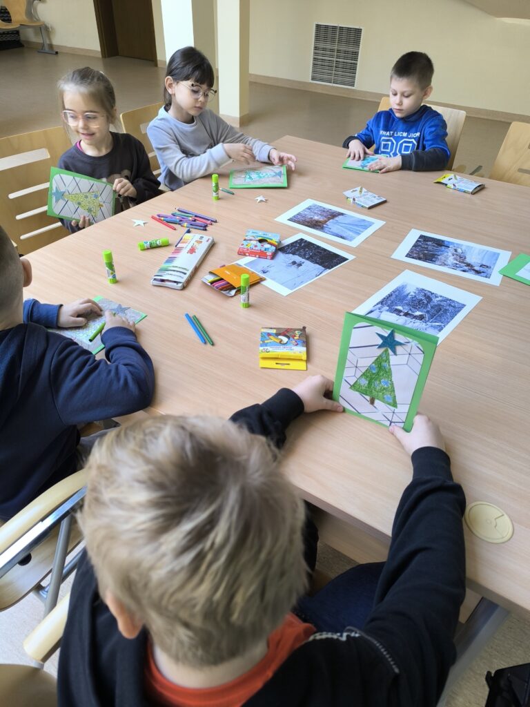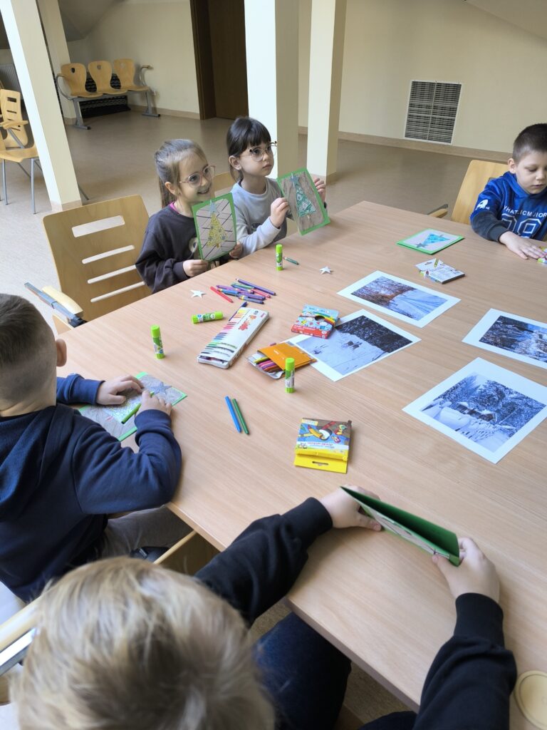 Z dużym zaangażowaniem wykonały także własne zimowe kartki, które stały się piękną pamiątką spotkania oraz dowodem ich kreatywności. W trakcie zajęć wysłuchały opowiadań, wierszy i przysłów związanych z zimową tematyką, a na zakończenie obejrzały animację „Reksiowa zima”, która wywołała wiele uśmiechów i radości.
